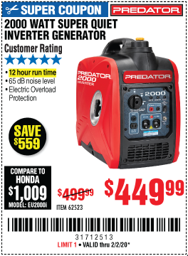 Predator 3500 Inverter Generator Coupon - Harbor Freight Tools Email Newsletters Shop Sales Discounts And Coupon Codes Page 27 : As an inverter generator, the predator 3500 provides a clean power curve, so you don't have to worry about using it to power sensitive electronic devices such as laptops and smart phones.. Visually, the predator 3500 is striking. Was previously considering a similar champion model for an additional $150. As an inverter generator, the predator 3500 provides a clean power curve, so you don't have to worry about using it to power sensitive electronic devices such as laptops and smart phones. New harbor freight 3500 inverter gen page 3 airstream forums. When does harbor freight predator 3500 watt coupon expire??