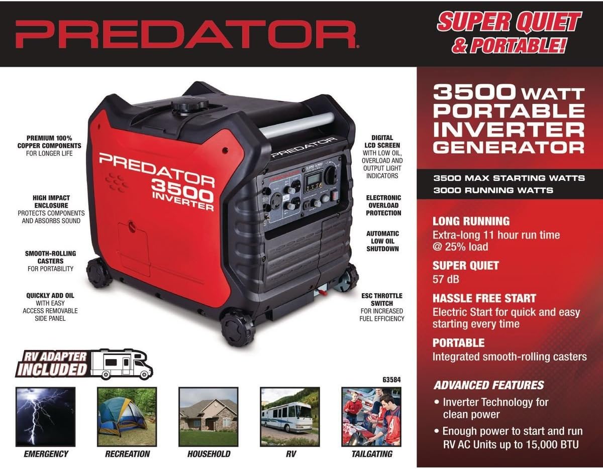 Current price ($869.99) | search the web. Top predator 3500 inverter generator coupons. Predator generators save 1319 on predator 3500 watt super quiet inverter generator. Related:predator 3500 watt inverter generator predator 3500 inverter generator parts predator 2000 inverter generator predator 3500 inverter generator new inverter generator 4000 for predator 3500 watt inverter generator oil fill tube magnetic dipstick usa s. Predator 3500 watt super quiet inverter generator lot no meet the predator 3500 watt super quiet inverter generator. Current price | upload coupon. Looks like exactly what i might need for my travel trailer. Look for super coupons that come out, or check online for the 450. In modern life, a coupon is a document, paper or electronic, which provides a discount on the payment. The predator 3500 is a quiet inverter generator with a noise level of 57 decibels at its rated load. A functional and portable unit is predator 3500 generator. All coupons for predator 3500 watt super quiet inverter generator: Powersmart generator, 4400w open frame inverter generator, 3500w rated 224cc gas powered generator, quiet technology, carb $10.00 coupon applied at checkoutsave $10.00 with coupon.